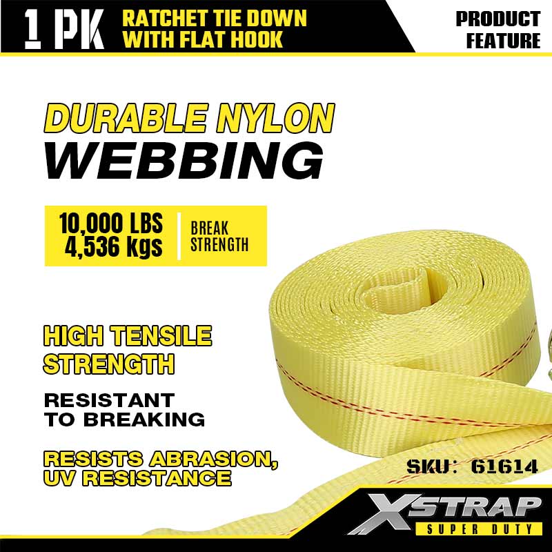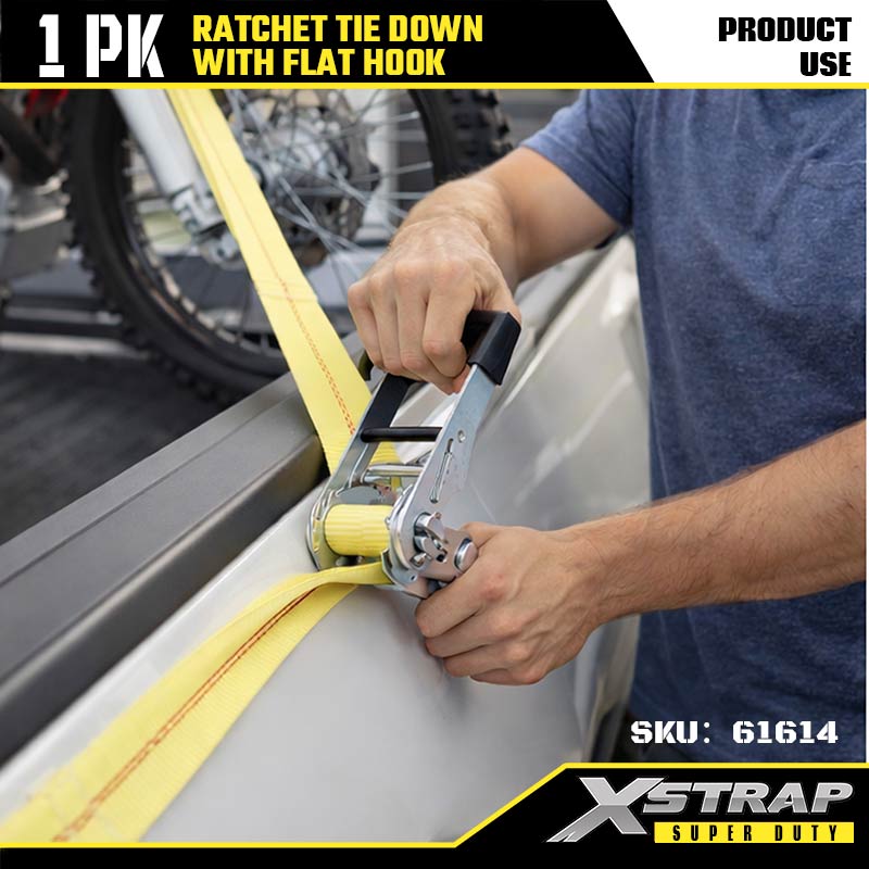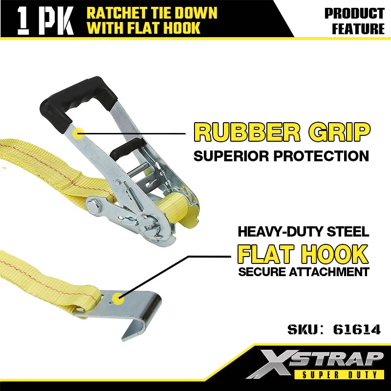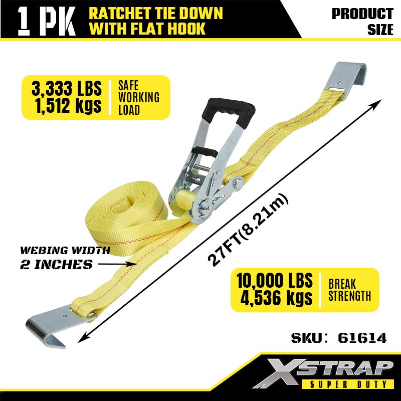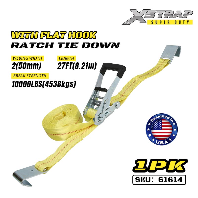 Xstrap Ratcet Tie Down dengan Flat Hooks, 2” x 27' Polyester Tie Down Strap Ratchet Strap, Tali Pengaman Kargo Kapasitas 3333lbs dengan Flat Hooks untuk Trailer Tugas Berat, Perahu Ski Trailer Flat Bed, Mobil Kecil, Alat Berat.