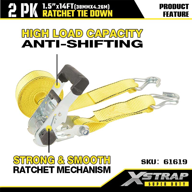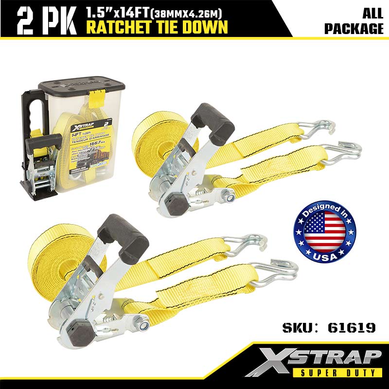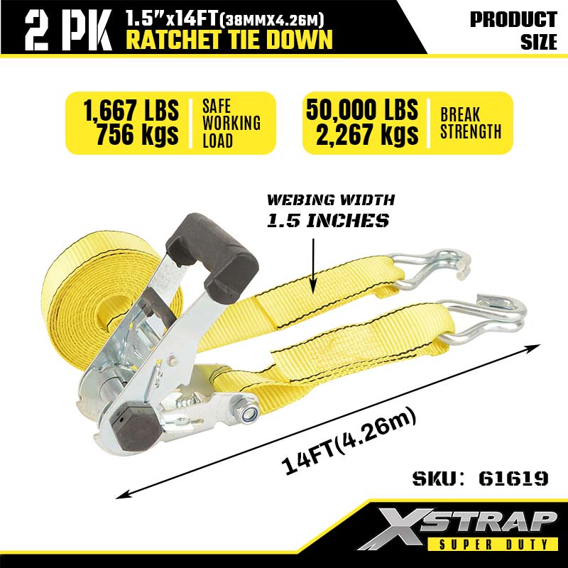 Xstrap 2PK Ratcet Tie Down dengan Kait J Ganda, Tali Ratchet Tali Pengikat Poliester 1-1/2” x 14', Tali Pengaman Pengikat Kargo Kapasitas 1667 pon dengan Kait J Ganda untuk Trailer Tugas Berat, Perahu Ski Trailer Tempat Tidur Datar, Mobil Kecil, Alat Berat.