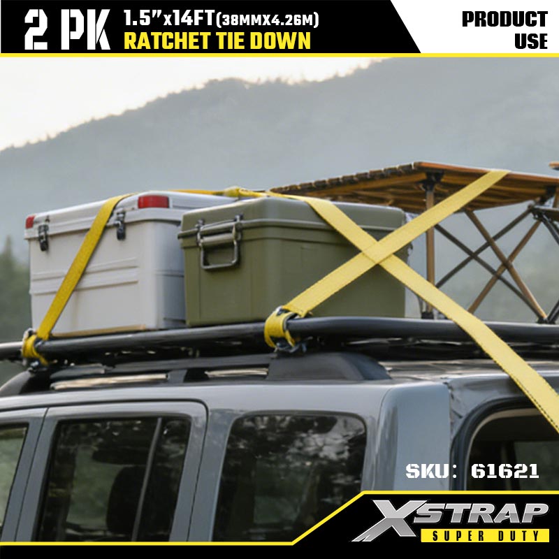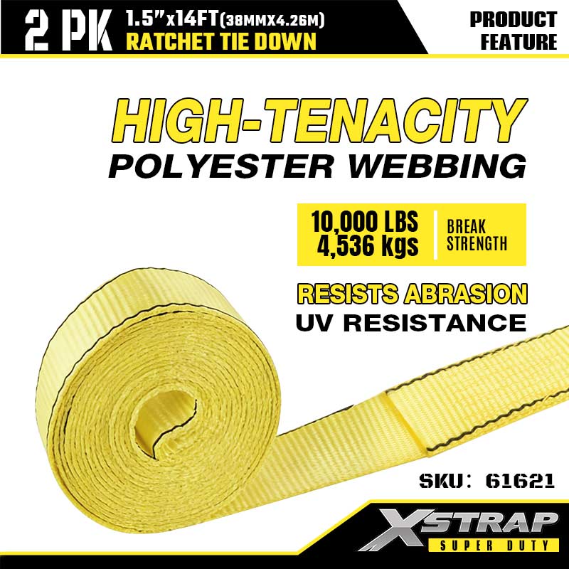 Xstrap 2PK Ratcet Tie Down dengan Kait J Ganda, Tali Ratchet Tali Pengikat Poliester 1-1/2” x 14', Tali Pengaman Pengikat Kargo Kapasitas 1667 pon dengan Kait J Ganda untuk Trailer Tugas Berat, Perahu Ski Trailer Tempat Tidur Datar, Mobil Kecil, Alat Berat.